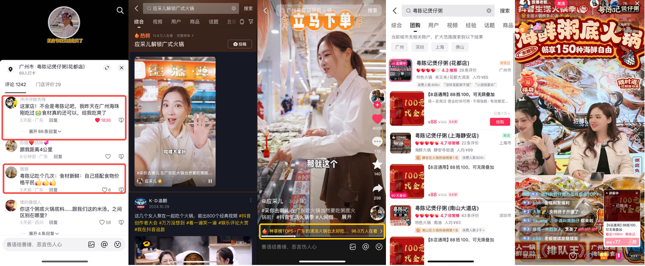粤陈记煲仔粥本就拥有不俗口碑,他们选择请出用户老熟人——拥有400多万平台粉丝的演员@应采儿,来提升用户的品牌感知。在应采儿的镜头下,种类繁多的鲜活水产、码放整齐的各色肉类、现搓的“四打天王”等招牌菜都显得格外诱人。而帮下菜品等周到服务的展现,也让用户看到商家的品质,直接对品牌的好感度直线up。闻讯而来的网友在评论区“团建”,分享满意的用餐体验。讨论热度飙升,直接带动话题#广东的清汤火锅也太好吃了 登上全国种草榜top5,#应采儿解锁广式火锅 登上同城top3,为商家带来一大波高转化的流量,商家搜索上涨89%,达到品牌年度峰值,由此带来的gmv更是达到70万。