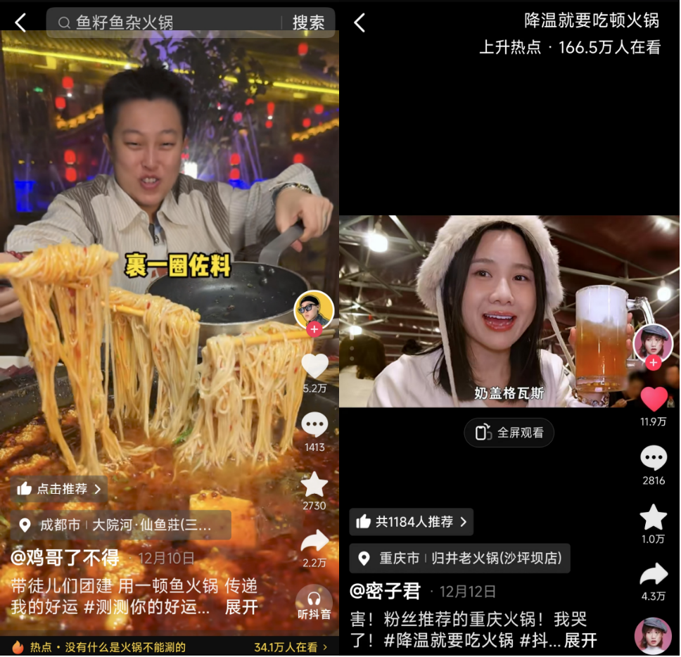 【抖音生活火锅季】还打造了#秋冬在成都来一顿火锅绝了、#火锅一涮烦恼消散、#杨迪教你川渝火锅正确吃法、#这个冬天我们一起去重庆吧 多个火锅话题热点,持续引爆活动氛围,累计收获1.1亿曝光,话题下的短视频内容更是给商家带来429万的gmv增长。