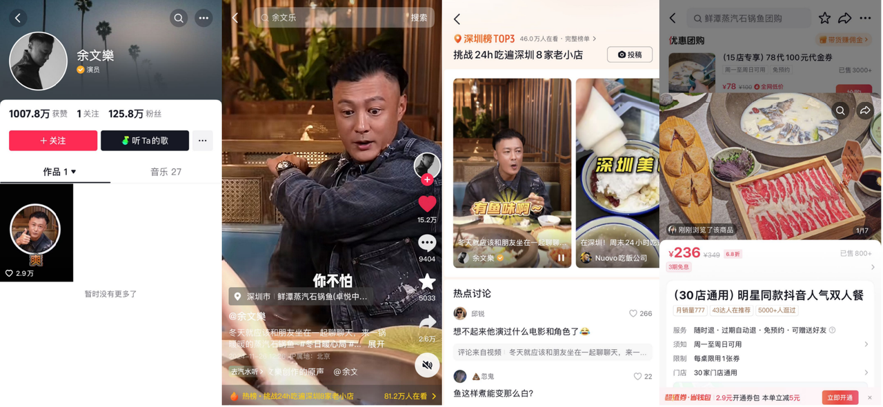 广东人@余文乐 探店【鲜潭蒸汽鱼火锅】,这也是他在抖音发布的首条视频。颇有“健身人自我修养”的他,放弃了炸腐皮等热量炸弹,点了招牌鱼汤底和江团鱼。猛猛吸入鲜美鱼汤,大口吃下绿色蔬菜,他一边和身边人拉拉家常、聊聊吃饭的口味习惯,一边真诚劝大家可以常常与和好友相约餐馆干饭,温馨又轻松的氛围让人忍不住嘴角上扬,而口味挑剔的广东人都亲口认证的食材鲜美,也让屏幕前的观众纷纷心动种草。很快视频点赞突破15万,登上深圳同城榜top2,累计收获880万曝光,为商家带去可观且高转化的流量增长。仅发布三天,视频挂载poi进入次数就提升46倍,加上明星同款-抖音独家套餐的推出,上线七天单品支付就突破20万gmv。