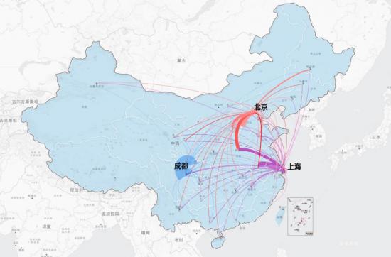 (北京、上海、成都地区骑手流入图)