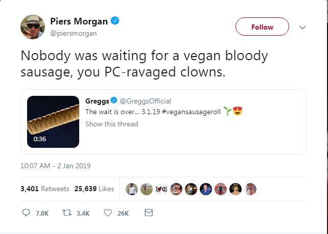 on greggs' announcement, the tv presenter and newspaper columnist piers morgan tweeted: "nobody was waiting for a vegan bloody sausage, you pc-ravaged clowns."