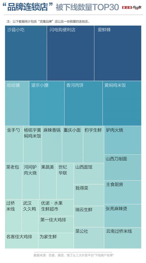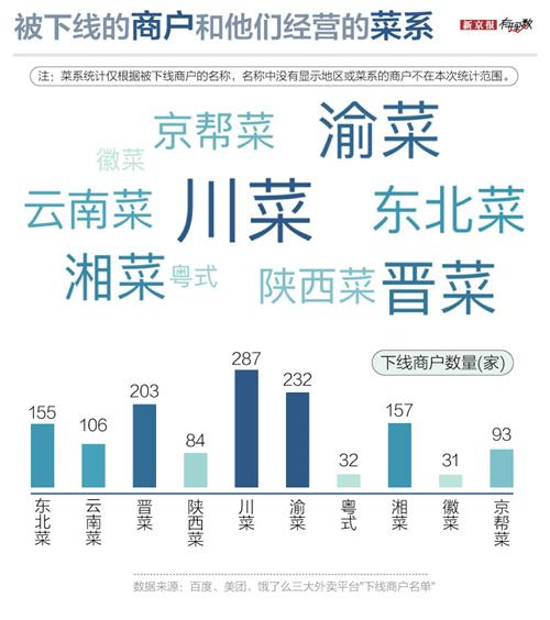 在北京市食药监局的监管下,百度、美团、饿了么三大平台陆续下线违规店铺。我们整理相关数据后发现,截至目前,下架店铺已达两万多家。其中,川渝菜系以及一些“克隆品牌”的外卖商家最容易出问题。
