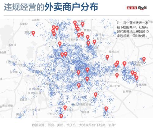 在地理分布上,可以说是“有外卖的地方就有问题商户”。朝阳、海淀和昌平三个区被下线的外卖商家最多。整体上看,商场、写字楼附近是这些违规外卖商家“蜗居”的首选。