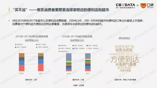 cbndata《2018生活消费趋势报告》显示,对比2016年和2017年超市以及便利店的消费数据,可以发现200米以内,200-500米的超市和便利店订单占比均呈上升趋势,消费者对于便利店方便到达的特征更为看重,也更愿意去家附近的便利店和超市采购。