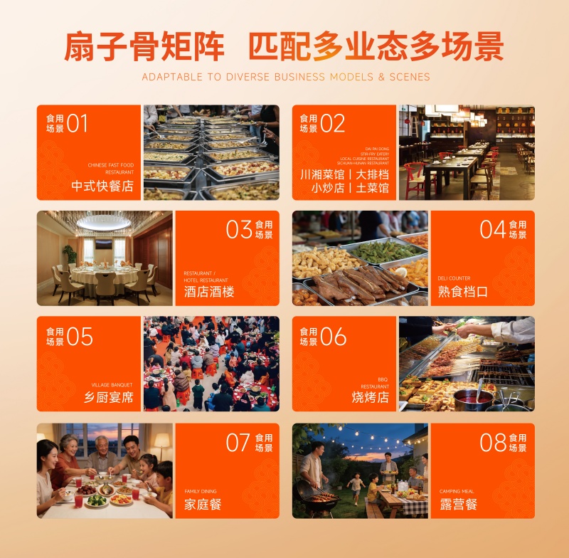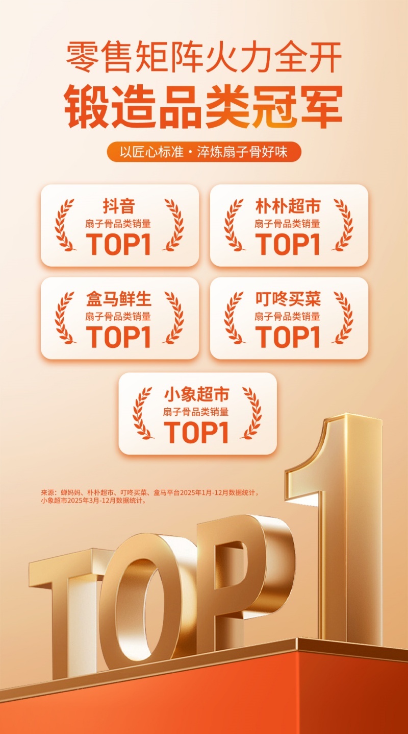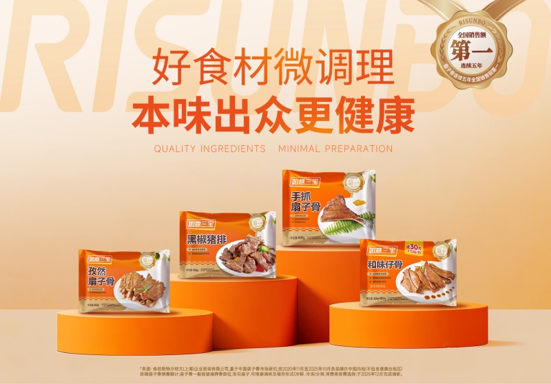 依托强大的研发实力,如意三宝在单一爆款的基础上,逐步构建起覆盖多场景需求的产品矩阵,实现b端与c端市场的双火爆。在b端市场,针对乡厨宴席、酒店餐饮、快炒店、烧烤夜宵等不同业态的核心需求,精准推出手抓扇子骨、孜然扇子骨、蒜香扇子骨、快炒扇子骨等多款产品,凭借标准化品质与高效出餐特性,成为上万家终端餐饮的优选食材;在c端市场,聚焦都市白领、宝爸宝妈等群体的烹饪需求,推出清洁标签的孜然扇子骨、高性价比的蒜香扇子骨等产品,适配空气炸锅、平底锅等多种家用厨具,免洗免切的特性大幅降低烹饪门槛,同时以老少咸宜的风味在银发群体中收获广泛好评。