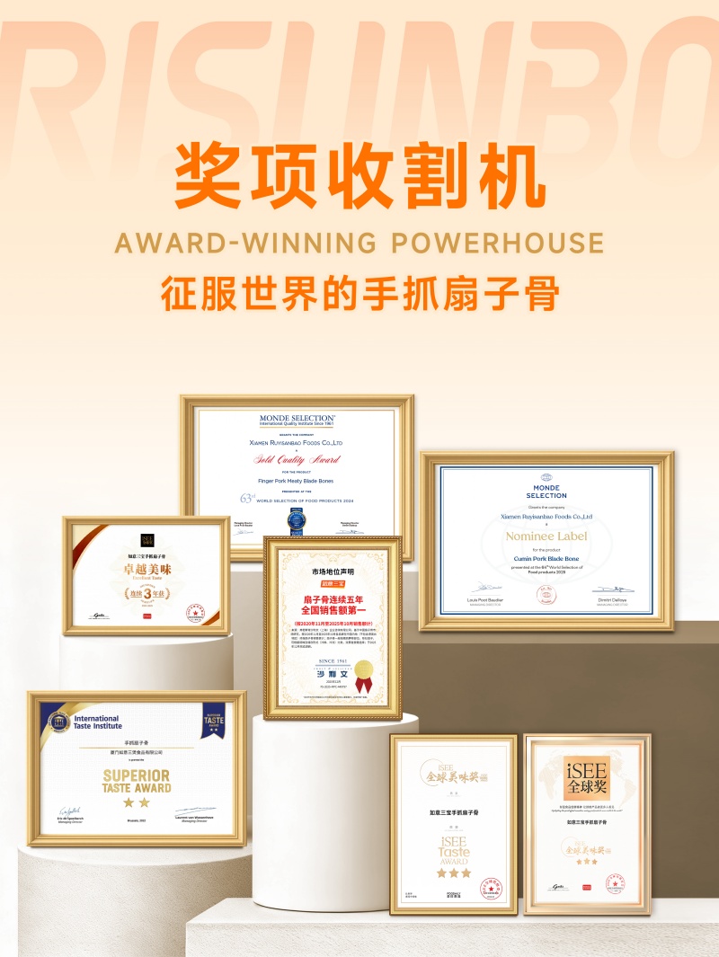 在食品行业品质为王的竞争内核下,如意三宝始终将产品力作为核心竞争力,过硬的品质也赢得了国际权威机构的认可。其手抓扇子骨连续三年斩获isee全球美味奖3星荣誉,连续两年摘得国际蒙特奖金奖,孜然扇子骨等多款核心产品也获得各美食大奖专业评审团的高度评价。这些国际奖项不仅是对产品品质的有力背书,更成为品牌构建差异化竞争优势的重要附加值。