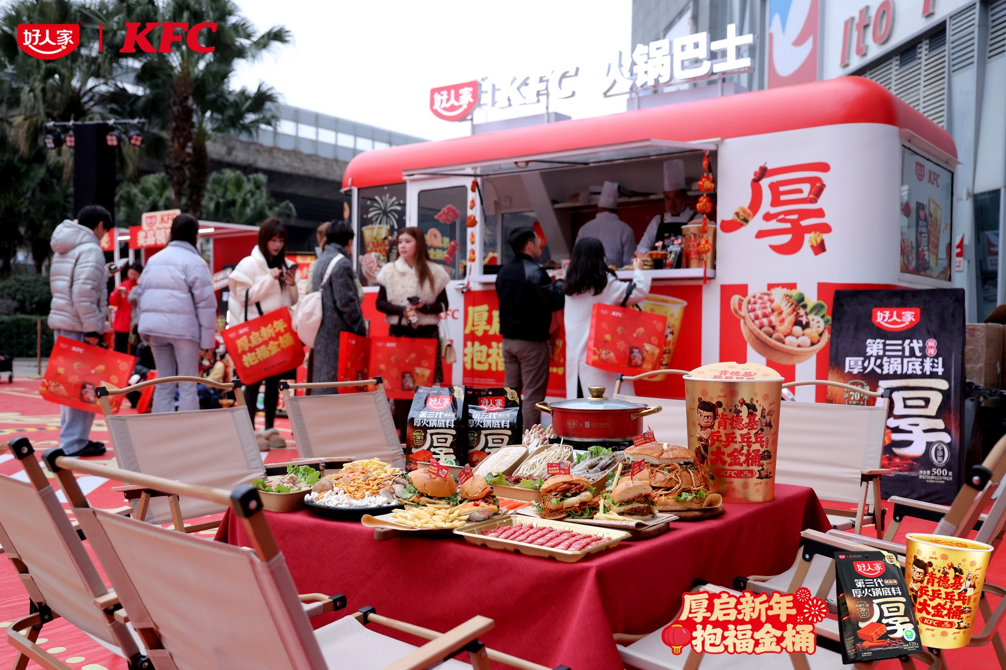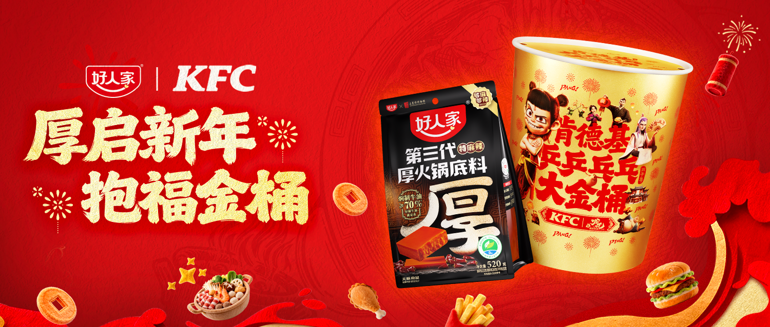 这场火出圈的中西混搭,源于复合调味料龙头品牌好人家与快餐巨头肯德基的跨界联动。双方推出的「厚启新年,抱福金桶」限时活动,将好人家的核心产品“厚火锅底料”与肯德基新春金桶相结合,用接“厚”运的美好寓意,精准回应了春节期间人们对“浓厚”风味与“浓厚”情感的追求,在熟悉的快餐空间里,创造了一种全新的年味记忆。