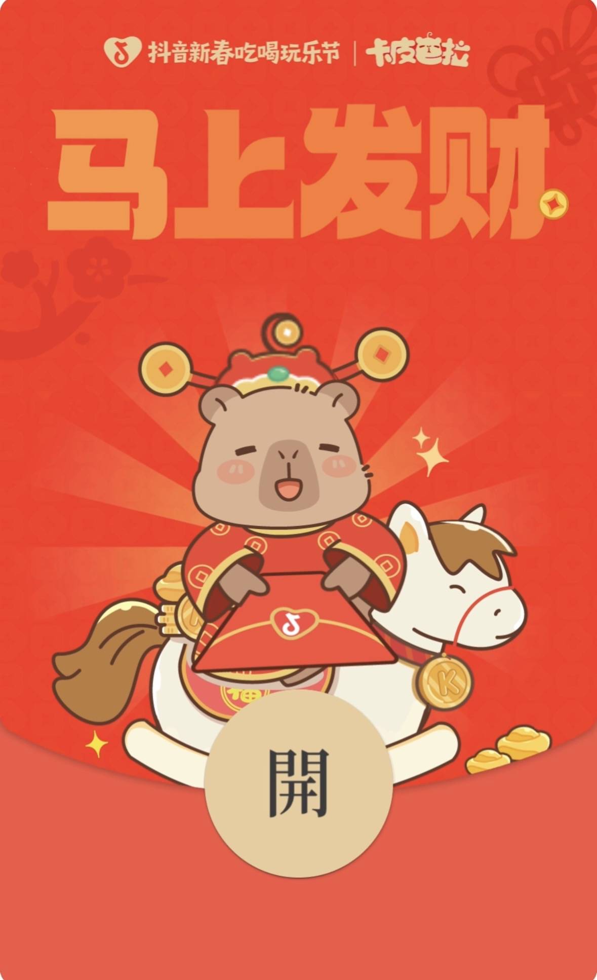 过年期间,抖音新春吃喝玩乐节联动卡皮巴拉带来重磅惊喜,大年初一至初七,抖音生活服务携手泸溪河、粒上皇、茶百道、茉莉奶白、塔斯汀、dq 冰淇淋、沪上阿姨、七大品牌,每天上线2026份免单,从甜品饮品到零食和特色美食,陪大家新年七天乐享年味。上抖音搜“春节免单”进入活动会场,初一到初七每天上午10点输入口令「上抖音寻年味抢免单」即可参与抢2026份免单。