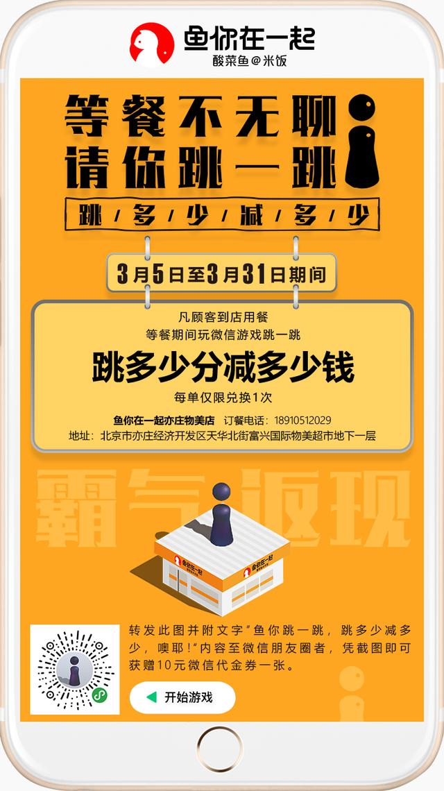 那么,“鱼你在一起”酸菜鱼快餐是如何借势的呢?没有什么真金白银的现金更能打动顾客了,据笔者了解,在“跳一跳”的借势上,“鱼你在一起”酸菜鱼快餐玩起了“跳多少,送多少”的现金赠送互动,就如曾经火爆一时的西贝莜面村,猜拳活动一样,给顾客带来了真正的好玩、易参与和优惠。