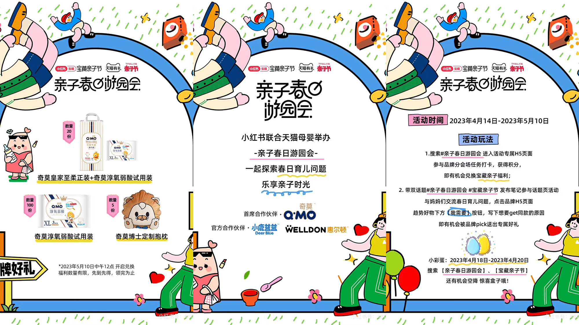 2023年,“育儿精细化元年” 席卷而来。小红书与天猫母婴合作,举办「亲子春日游园会」发布六大育儿趋势,联合权威专家、母婴博主解答春季育儿高频问题,如小敏感防护、辅食添加等,精准捕捉宝妈群体对成分安全与专业护理的深度需求。