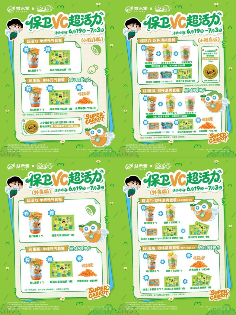 本次联名活动以“健康双补给”套餐为核心,巧妙推出单杯元气套餐与双杯清爽套餐。消费者在小程序下单,购买单杯橙c胡萝卜或者橙c胡萝卜搭配胡萝卜芒芒椰/粉黛苹果,可获得超活力发泡贴纸、卡套挂件等限定周边。令人惊喜的是,上小程序还能参与“疯狂的萝卜”活动,有机会赢取益禾堂黄金纪念币;外卖平台则提供更灵活的饮品组合,购买橙c胡萝卜搭配胡萝卜芒芒椰(也可选两次单杯),同样赠送发泡贴纸、卡套挂件。两款套餐均有限时限量供应的“彩蛋版”,可额外加赠两根水果胡萝卜,结合融合游戏视觉与胡萝卜元素的限定杯贴,活动构建了丰富的感官体验。