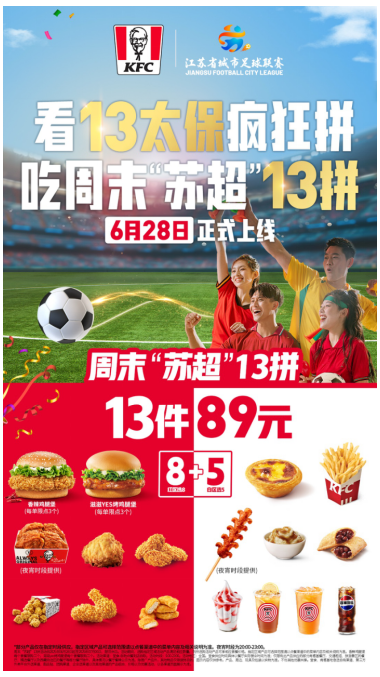 加入“苏超”大家庭后,肯德基将积极支持“苏超”宣传推广工作,策划一系列有趣、有梗、有料的活动,将苏超文化、球迷热情和消费体验紧密串联起来。据了解,肯德基将于6月28日起,全渠道周末特别推出“周末苏超13拼”活动。届时,4300多家肯德基线下门店的点餐屏也将化身电视屏幕,实时直播比赛盛况。
