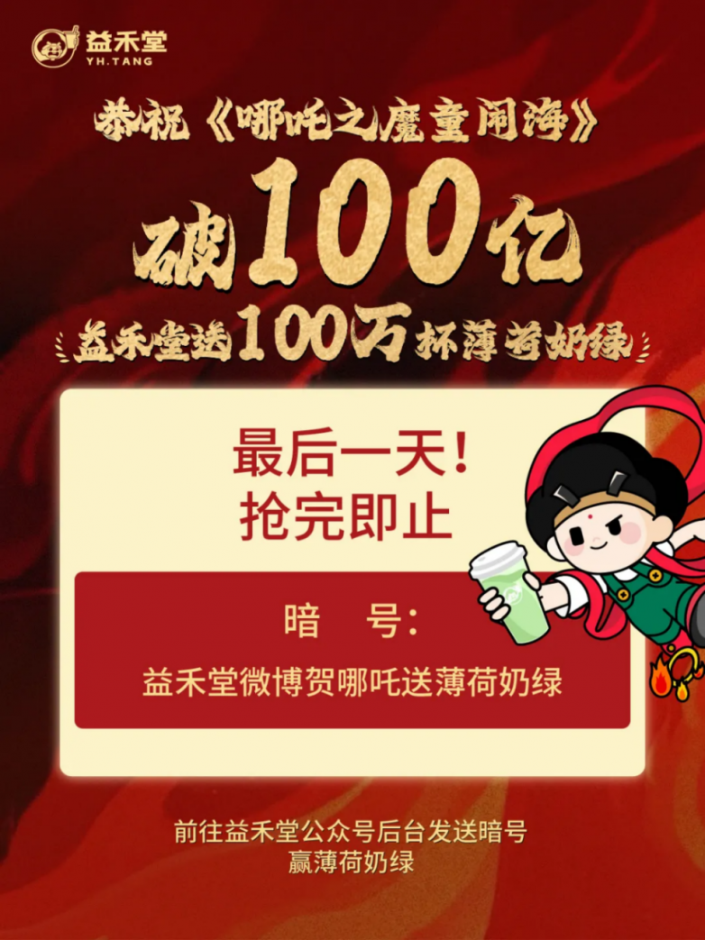 2025年初,春节联欢晚会小品《点点关注》中出现的薄荷奶绿引发全民热议,这款带有清新绿色标识的产品一夜之间成为社交平台讨论焦点,益禾堂官方账号迅速认领了这一热门话题,并立即推出新年送薄荷奶绿的活动。紧接着在元宵节期间,品牌借势《哪吒2》票房破百亿,推出“免费送奶绿”活动,再次登上热搜榜单。这种“文化热点 节日营销”的组合拳,让薄荷奶绿实现了从产品到文化符号的跃升。
