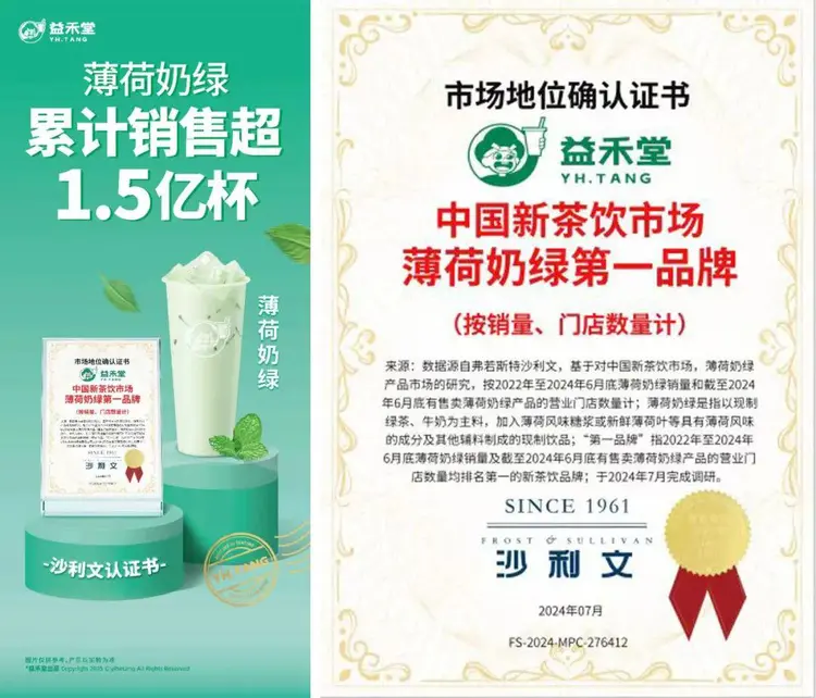 2022年,在茶饮市场陷入“奶茶大战”的混战时期,益禾堂敏锐捕捉到年轻消费者对清爽口感的需求空白,将薄荷这一元素创新性地引入茶饮领域,打造出具有标志性意义的薄荷奶绿,并凭借独特的记忆点、强烈的感官体验迅速打爆市场。产品单日销量高达60万杯,累计销售1.5亿杯,荣获沙利文认证的“中国新茶饮市场薄荷奶绿第一品牌”称号。