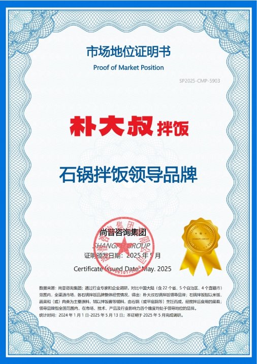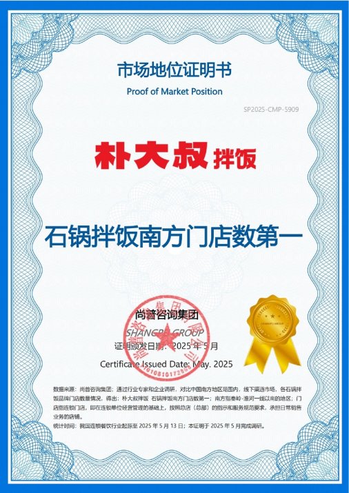 2025年5月,尚普咨询集团向朴大叔拌饭颁发市场地位声明书。此次朴大叔拌饭荣获尚普咨询【全国门店超1000家】【石锅拌饭领导品牌】【石锅拌饭南方门店数第一】市场地位声明,标志着朴大叔拌饭在我国餐饮行业中的卓越地位及市场的高度认可。