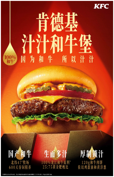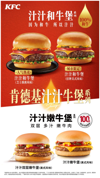 在全球饮食文化深度交融的背景下,富含优质蛋白质的牛肉汉堡愈发受到中国消费者热捧。其中,以脂肪分布均匀、口感细嫩多汁著称的和牛肉,成为高端市场的热门选择。为了把优质的和牛肉从牧场端到中国人的餐桌,肯德基与龙江元盛达成战略合作,精选国产高端雪花牛肉品牌龙江和牛,于2021年5月重磅推出首款长线产品——汁汁厚牛堡,并于2024年迭代升级为汁汁和牛堡。
