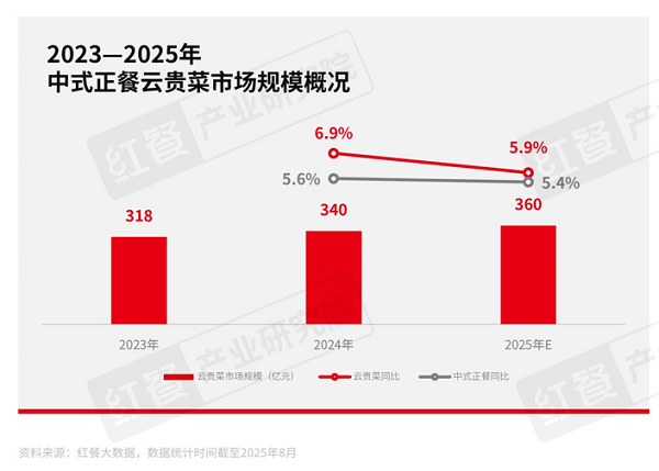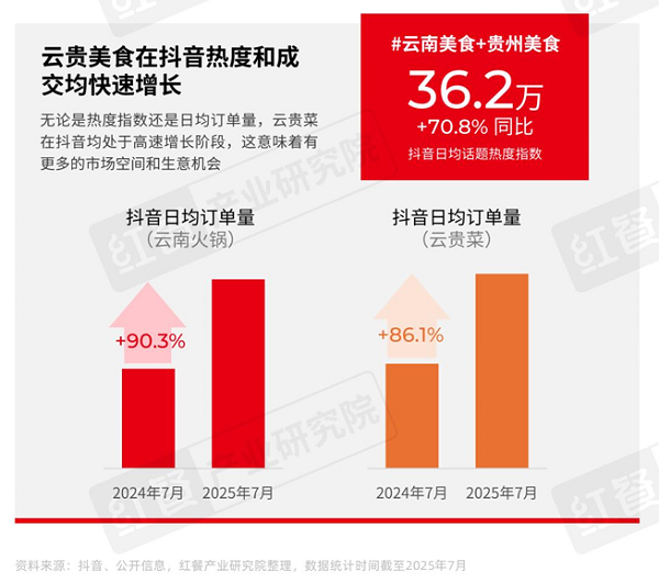 最近,红餐产业研究院联合抖音生活服务发布了《2025云贵菜发展报告》,报告显示,截至 2025 上半年,国内云贵菜门店数量达到了 4.2 万家,较前几年大幅增长,相关市场规模突破到 360 亿元。
