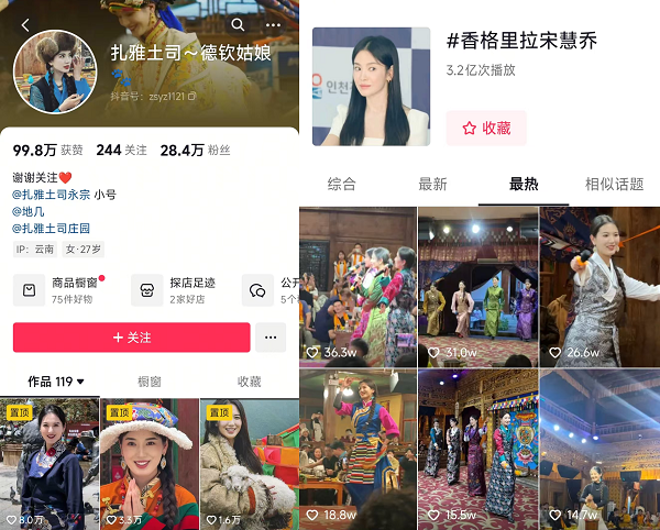 值得注意的是在他们众多舞蹈演员中,有一位当地女演员因外貌出众被游客们戏称为“香格里拉宋慧乔”,该演员在抖音吸引了 28 万粉丝关注,很多网友看到她的舞蹈视频后甚至会慕名前往“应援”。