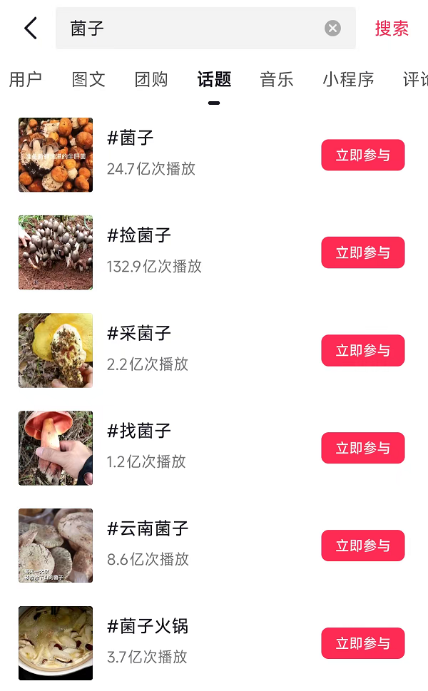 比如美食赛道的头部博主 @老韩头 ,凭借一条带着爷爷吃见手青的 vlog 视频,收获百万点赞;再比如“采野生菌子”等带有探险、刺激内容的视频在抖音收获了 10 亿人次播放。