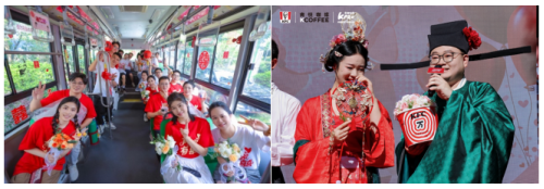 同一时间,在肇庆星湖国际广场,肯德基联合民政部门打造的“简约婚礼”也正在上演——新人们乘坐“肯家有囍专线”巴士在城市穿梭、用肯悦咖啡行交杯合卺之礼;在长沙解放西路餐厅,五对因肯德基结缘的“肯家弟子”穿着中式婚服,在“月老”的见证下共诵婚书,在非遗传承人指导下剪出独创的“喜”。
