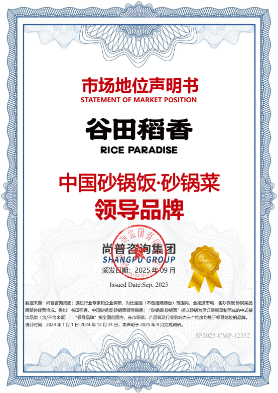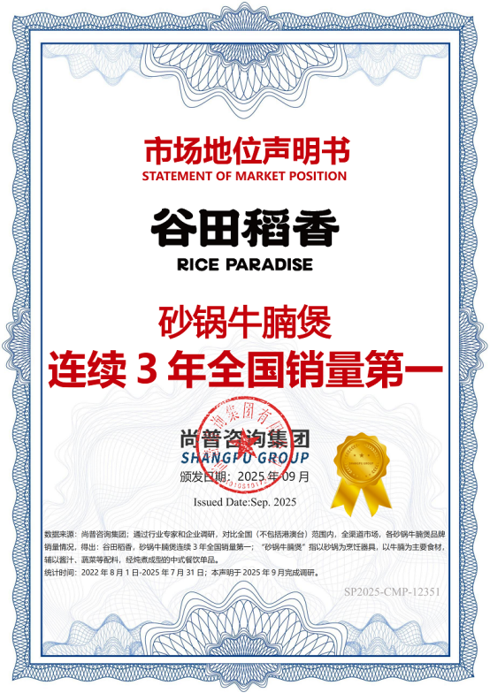 2025年9月,尚普咨询集团向谷田稻香颁发【中国砂锅饭·砂锅菜领导品牌】和【砂锅牛腩煲连续3年全国销量第一】两项市场地位声明书,标志着谷田稻香在餐饮连锁行业的标杆典范地位及市场的高度认可。