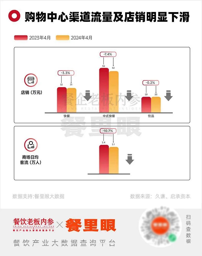 首当其冲的,是门店客流下滑。据久谦数据,2024年商场日均客流更显著的下滑,超过了接近10%。受此影响,快餐、中式正餐、饮品等门店店销均有所下滑。
