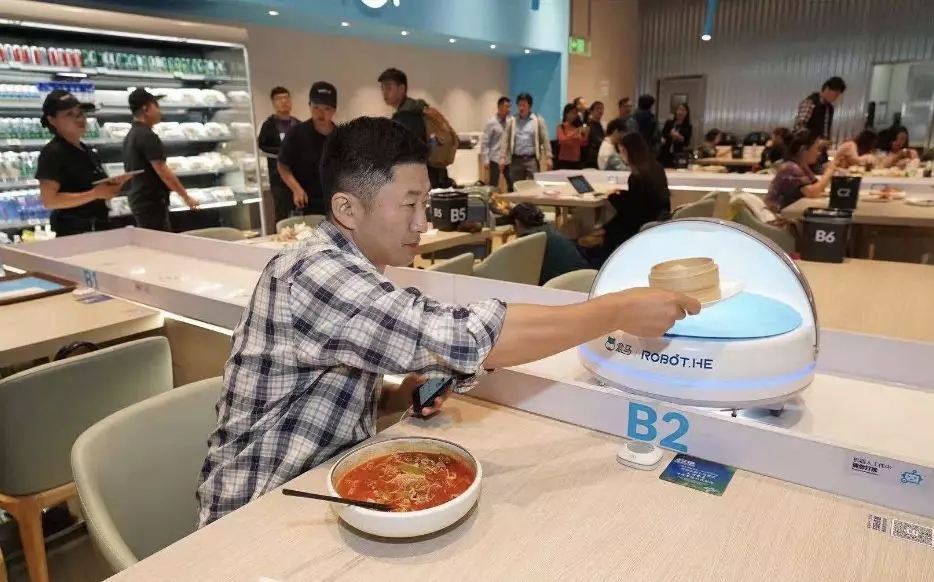 盒马第一家机器人餐厅,位于盒马鲜生的上海南翔店,在今年2月开始营业。