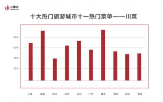 报告显示,上海、北京、杭州、广州、成都、重庆、南京、苏州、武汉、青岛分别在十大热门旅游城市榜单之列。从城市地理位置来看,这十大城市相距甚远,从特色美食来看,也是酸甜鲜辣各有千秋。但二维火大数据显示,十一期间“川菜”占据了十大城市热门菜单的前半壁江山。