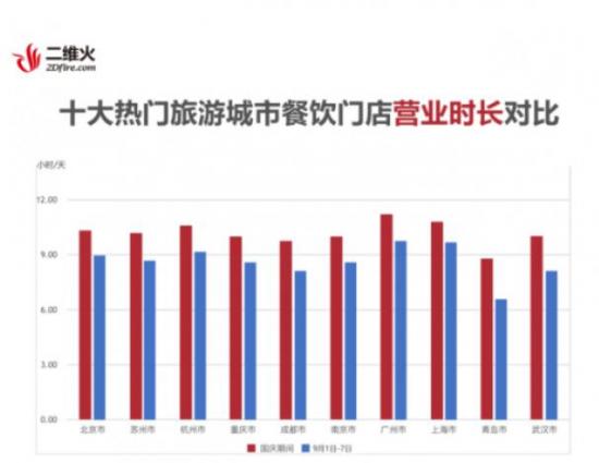 报告中提到,北京某老字号餐饮在十一期间日日爆满,午餐翻台率均超过2次,晚餐翻台率甚至能超过3次。与此同时,十大旅游热门城市在10月1号至7号的营业时长也比9月同期增加了72小时左右,相当于整整3天。