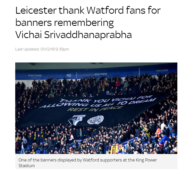 莱斯特城2-0战胜沃特福德的比赛,是莱斯特城前主席维猜逝世后蓝狐的第二场主场比赛。而客队沃特福德球迷的一个举动,让莱斯特城方面深受感动。