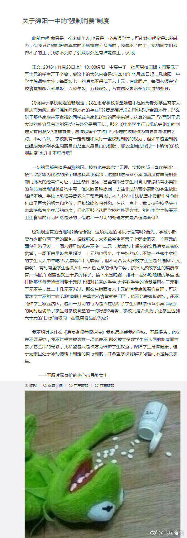 29日,一位匿名家长在微博发帖,称2018年11月28日上午10时,绵阳一中集中了一批每周校园饭卡消费低于五十元的学生开了个会,会议大体内容是:从2018年11月28日起,凡绵阳一中学生除通校生外,每周饭卡上的消费不得低于六十元,在此同时,每周必须在学校食堂刷够六顿早饭、六顿午饭、五顿晚饭,若有违反者给予记大过的处分。
