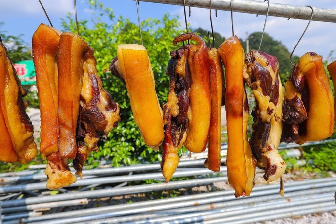 农家熏腊肉真的是常年挂在灶架上熏制,灶头常年烧的是木柴,这里的做腊肉用的跑山猪,吃着山泉水长大的放养猪,味道肯定是好啦。
