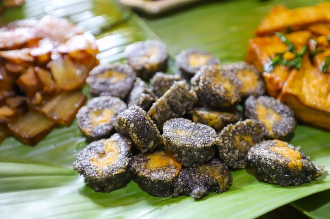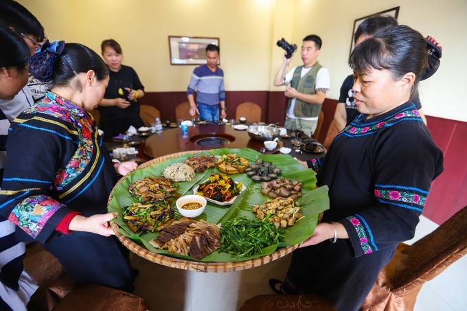 蕉叶簸箕宴里面的菜都可以自行选择搭配的,建议加上杂粮和五色糯米饭,比较特色。上菜的时候由两个穿民族服装的壮族妇女将做的菜用簸箕抬上桌。