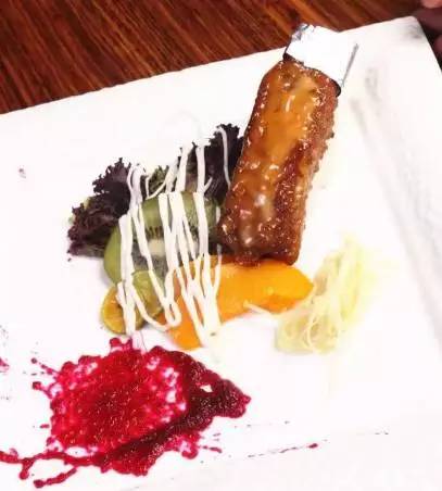 2、烤箱调至上下火180℃,放入肋排烤20分钟,期间每隔5分钟取出肋排刷一次酱汁,待肋排烤至表面金黄,取出每根为一份装盘,旁边摆上甜姜丝、黄桃片、猕猴桃片、青柠片、生菜叶点缀,在白盘一段放红心火龙果(打碎成茸)30克即可走菜。