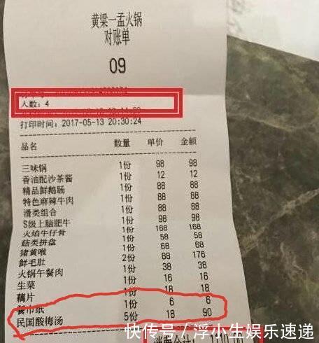 这是一份网友到“黄梁一孟”火锅店消费的小票,四个人去吃,总共消费1110元,人均差不多要300元,从小票网友还发现餐巾纸一份竟然要6块钱,酸梅汤一份竟然要18元,看到这里有网友调侃说,在学校我们喝酸梅汤是免费的啊!而且外面买也不过两三块钱一份,这可以10倍的差价啊!