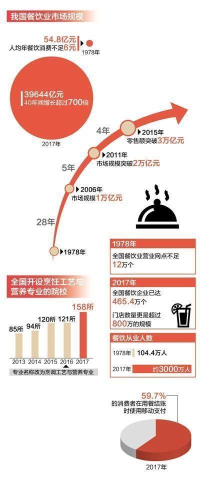 据中国烹饪协会统计,改革开放之初的1978年,全国餐饮业营业网点不足12万个,餐饮从业人数104.4万人;2017年,全国餐饮企业已达465.4万个,门店数量更是超过800万的规模,餐饮从业人数约3000万人,每年新增就业岗位约160万个。“深化改革,继续大力发展餐饮业,对稳定经济发展和扩大就业等方面意义重大。”姜俊贤说。