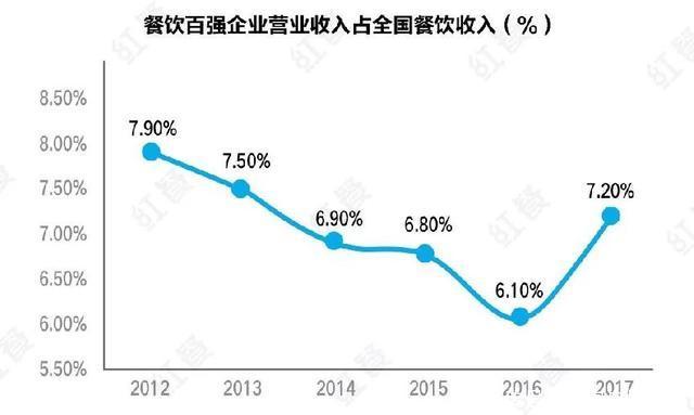 2017年我国餐饮收入达39644亿元,将近4万亿的市场收入规模下,餐饮百强企业仅贡献了7.2%。从历年数据来看,餐饮百强企业占全国餐饮收入的比重长期低于8%。