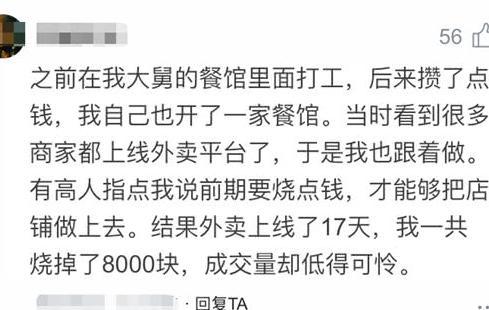 然而看问题不能只看优点,还需要看到他的另一面,下面给大家看看,一个餐馆老板在我昨天文章下面的留言:之前在我大舅的餐馆里面打工,后来攒了点钱,我自己也开了一家餐馆。当时看到很多商家都上线外卖平台了,于是我也跟着做。有高人指点我说前期要烧点钱,才能够把店铺做上去。结果外卖上线了17天,我一共烧掉了8000块,成交量却低得可怜,基本上就是零。为什么会出现这种情况呢?下面一起来看看: