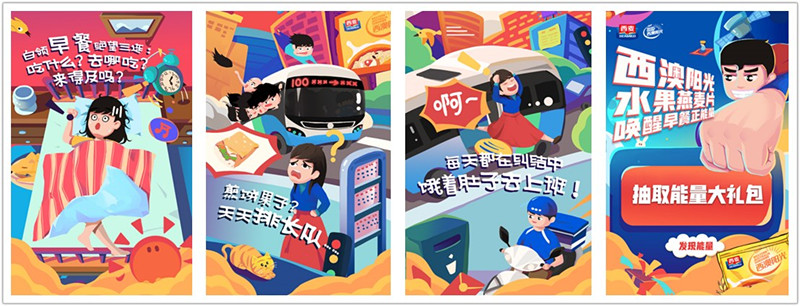一帧帧手绘卡通画面,趣味十足地描摹出了白领们为早餐纠结发愁的一个个似曾相识的场景,也无疑击中了目标人群的痛点,共鸣随之产生。并且,这个以“唤醒早餐正能量”为主题的小游戏,在抛出痛点的同时也给出了解决痛点的路径:选择西麦西澳阳光水果燕麦片,给你的早餐带来全新的“打开方式”,快手营养又美味。早餐选择困难症?一袋全hold住!而之所以叫“唤醒早餐正能量”,是因为西麦西澳阳光水果燕麦片相信,香甜可口热冲即食的西麦西澳阳光水果燕麦片,无疑会给新一天的生活注入满满的活力与正能量!