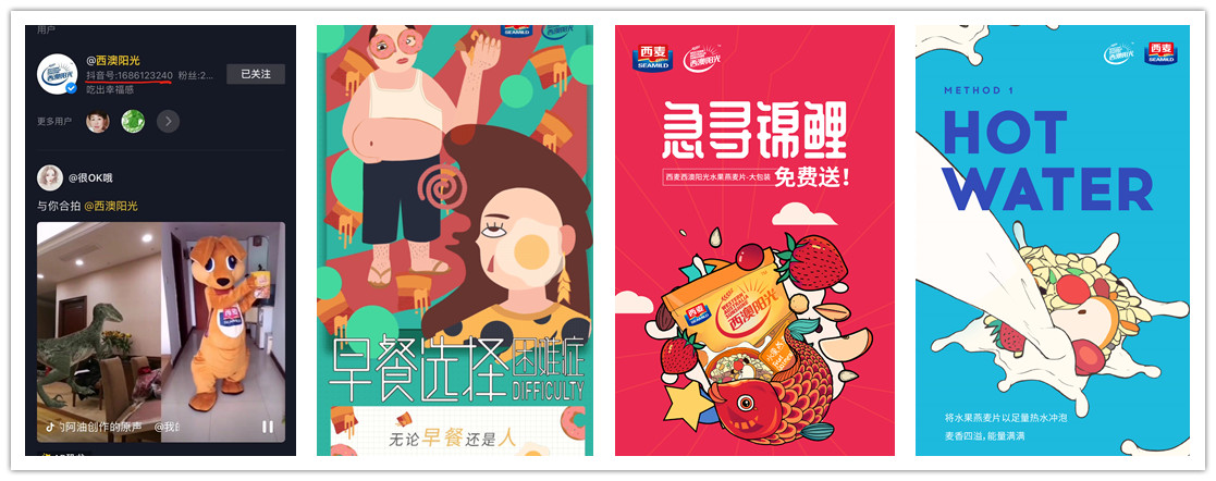 作为线上营销的“三驾马车”,微信、微博以及抖音如今已成为产品露出的有力渠道。西麦西澳阳光水果燕麦片在线上平台的传播过程中,摒弃了传统的简单粗暴的信息轰炸模式,转而采用生动新颖的长图文、gif海报、互动小游戏、抖音开屏及抖音挑战赛小视频等方式进行线上传播,吸引了大批以年轻上班族为主的目标受众。