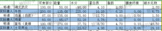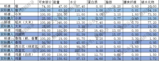以下是这位宝妈三餐及加餐食物重各种营养成分及热量情况: