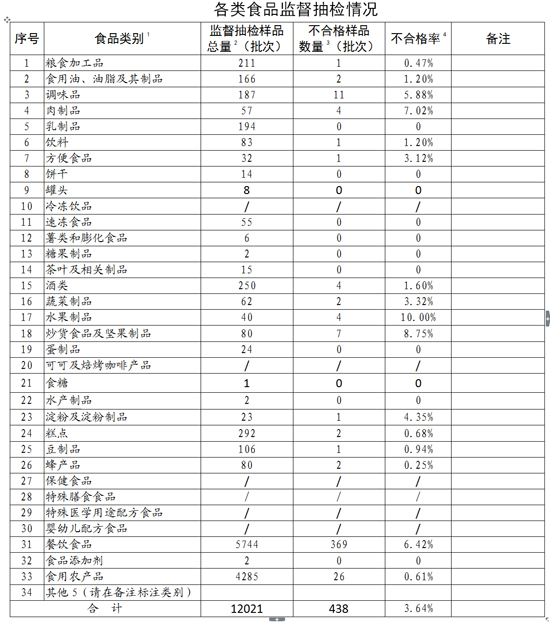 中国质量新闻网讯 2018年12月19日,甘肃省市场监督管理局凯发真人官网发布2018年11月份食品安全监督抽检分析情况的公告(甘市监公告【2018】第2期(总第2期))。根据食品安全抽检监测年度计划,2018年10月21日至11月20日,甘肃省市场监督管理局对全省范围内生产经营的27大类12021批次食品进行了抽检监测,合格11583批次,不合格438批次,样品不合格率为3.64%。