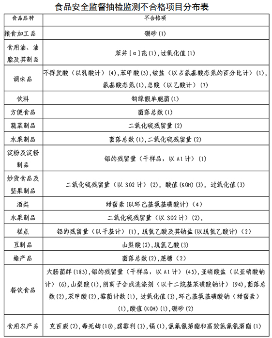 从样品检测的总体情况来看,本月所抽检的乳制品、饼干、罐头、速冻食品、薯类和膨化食品、糖果制品、茶叶及相关制品、蛋制品、食糖、水产制品、食品添加剂安全状况良好,合格率均为100%。通过对抽检数据的分析,此次抽检的食品中水果制品、炒货食品及坚果制品、肉制品、凯发真人食品、调味品、淀粉及淀粉制品、蔬菜制品、方便食品、酒类、食用油、油脂及其制品、饮料、豆制品、糕点、食用农产品、粮食加工品、蜂产品检出不合格,不合格率分别为10.00%、8.75%、7.02%、6.42%、5.88%、4.35%、3.32%、3.12%、1.60%、1.20%、1.20%、0.94%、0.68%、0.61%、0.47%、0.25%。