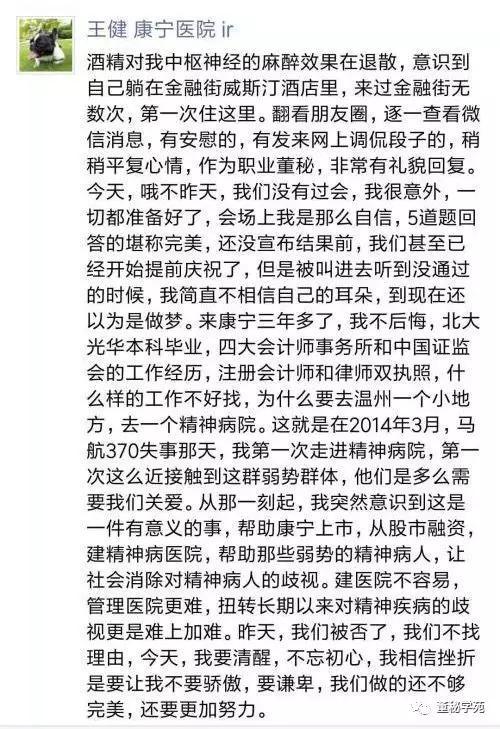 其实,因为ipo被否,悲伤的董秘又何止卞爱进,2018年1月23,康宁医院上会被否后,董秘王健更是发了几百字的朋友圈,心碎了。
