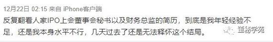 又一位董秘因为ipo被否“心碎了”,2018年初,康宁医院董秘王健在公司ipo被否后发了一段长长的朋友圈,2018年的12月22日凌晨2点多,苏州富士莱董秘卞爱进则发了一条微博“反复翻看人家ipo上会董事会秘书以及财务总监的简历,到底是我年轻经验不足,还是我本身水平不行,几天过去了还是无法释怀这个结局”。