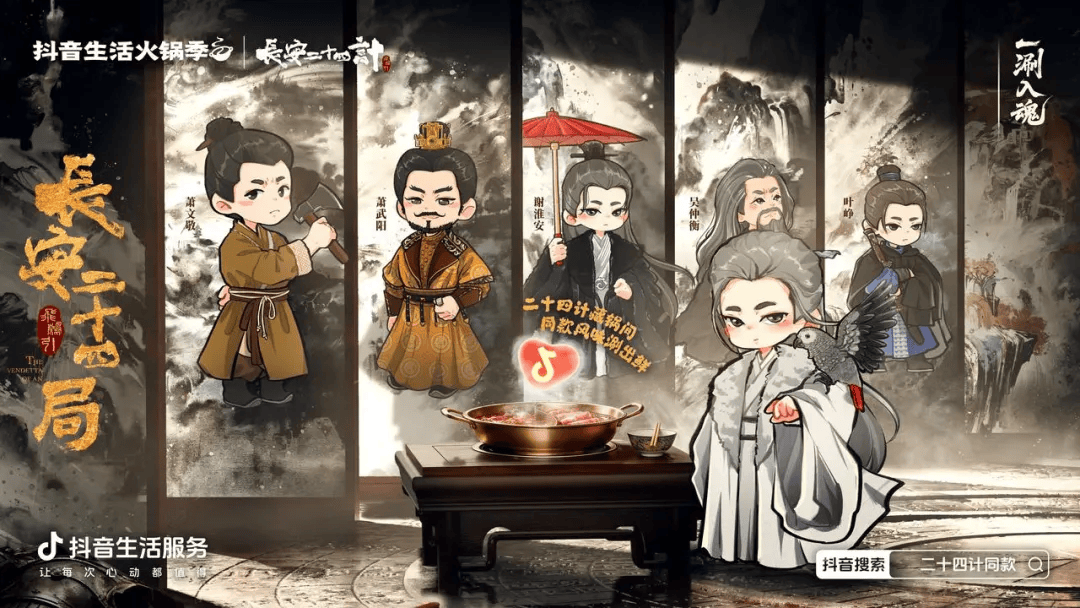 更进一步,活动还借势热门影视ip《长安二十四计》,联动沙胆彪、呷哺呷哺、朱光玉等24家火锅品牌推出联名产品。这不仅在社交平台引发了大规模“自来水传播”,更通过“联名品 直播”的整合营销,在活动期间创造了可观的销售转化。实现了平台流量转化、商家营收提升和文化ip破圈传播的三方共赢。