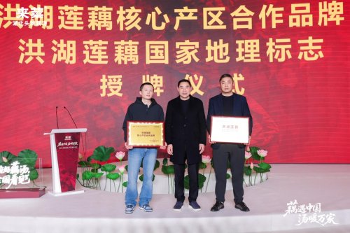 来菜莲藕基地负责人陈迅雷与来菜莲藕专家张藤洪完成了2000亩洪湖核心产区基地签约,湖北省莲藕产业发展协会会长赵道华向来菜授予洪湖莲藕核心产区合作品牌和洪湖莲藕地理标志牌匾。